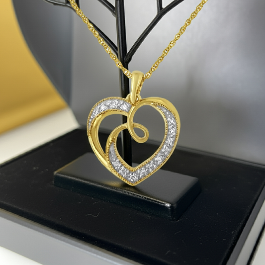 14K Yellow Gold Plated .925 Sterling Silver Diamond Accent Ribbon & Heart 18" Pendant Necklace (H-I Color, I2-I3 Clarity)