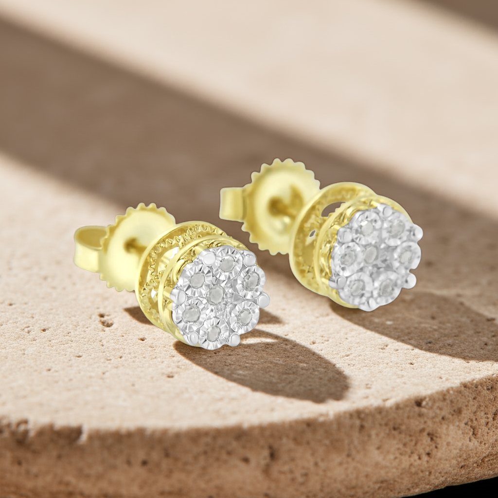 💎 These striking cluster diamond earrings are made in 14k yellow gold plated sterling silver and feature 1/7ct TDW of promo quality round cut diamonds.